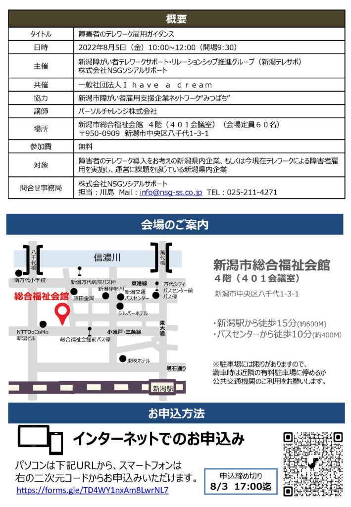 弊社と連携している団体の一般社団法人I have a dreamが、新潟障がい者テレワークサポート・リレーションシップ推進グループ(新潟テレサポ)、株式会社NSGソシアルサポートと共催で【障害者のテレワーク雇用ガイダンス】を開催します。