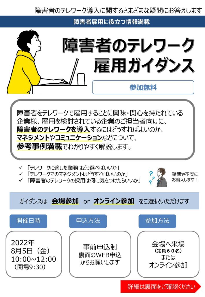 当日は、障がい者をテレワークで雇用することに興味・関心を持たれている企業様、雇用を検討されている企業のご担当者向けに、障がい者のテレワークを導入するにはどうすればよいのか、マネジメントやコミュニケーションなどについて、参考事例満載でわかりやすく解説します。