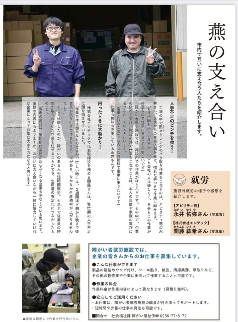 • 障がいがある人の短時間就労を採用いただいている株式会社エンテック様が広報つばめで取り上げられました📸