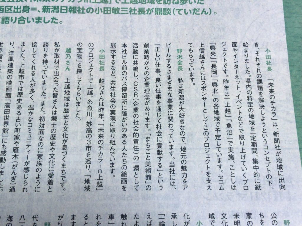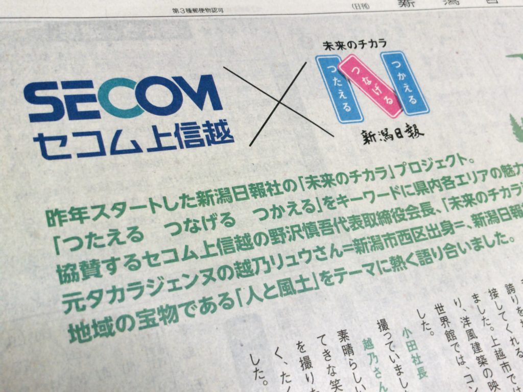 新潟日報(2020年2月1日号)セコム上信越×新潟日報社『未来のチカラ』で、セコム上信越野沢会長、越乃リュウさん、新潟日報社小沢社長が鼎談されています。