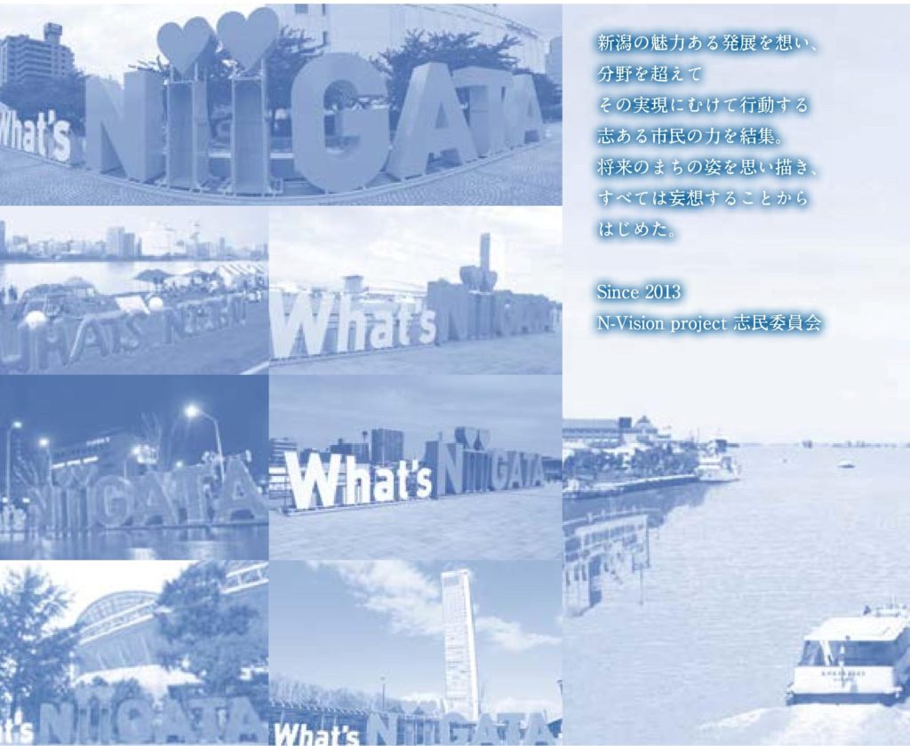 志民委員会N・VISION PROJECTは、2013年新潟の志ある市民が集い、将来のまちの姿を思い描きスタートしました。「What’s NiiGATA」モニュメントの狼煙を上げ、河川から港へと常に新しい新潟を提案してまいりました。今後も更なる新潟の発展を目指し、ウォーカブルでサスティナブルな街に向かって、常に挑戦し、NEXTDOORをひらいてまいります。今後とも志民委員会をよろしくお願いいたします。