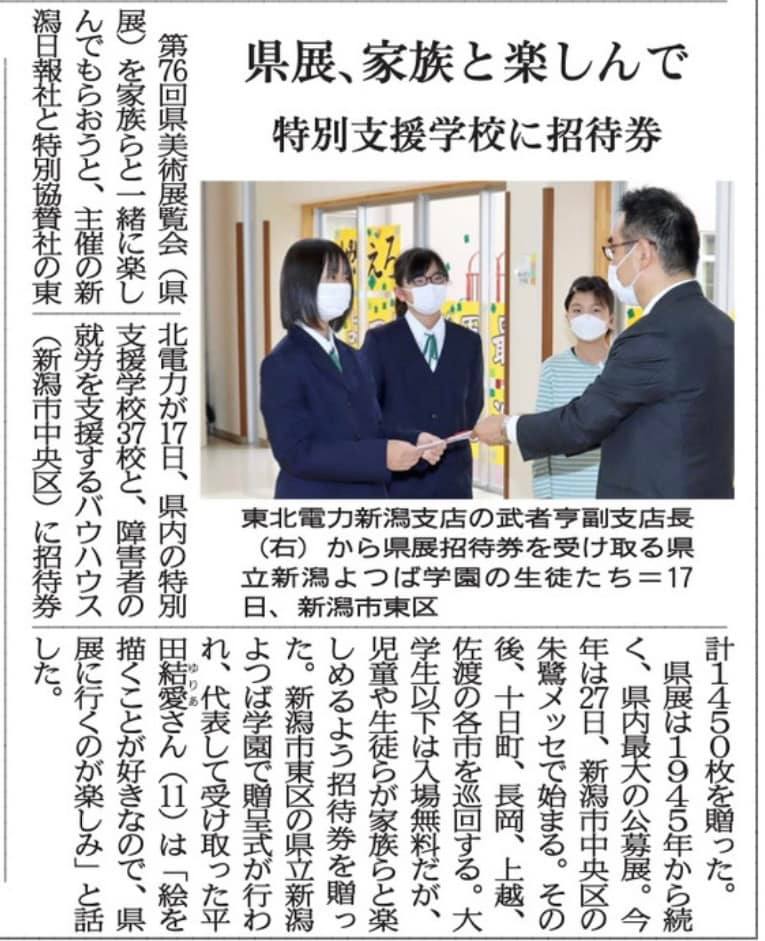 新潟県の美術展覧会を主催する新潟日報様と東北電力様から、障がいのあるアート作家さんとご家族へ❣️新潟県の美術展覧会のご招待券をいただきました。