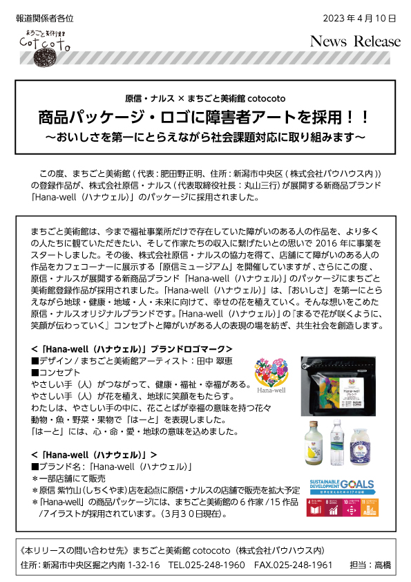 この度、まちごと美術館( 代表: 肥田野正明、住所: 新潟市中央区( 株式会社バウハウス内)) の登録作品が、株式会社原信・ナルス( 代表取締役社長:丸山三行)が展開する新商品ブランド 「Hana-well(ハナウェル)」のパッケージに採用されました。
