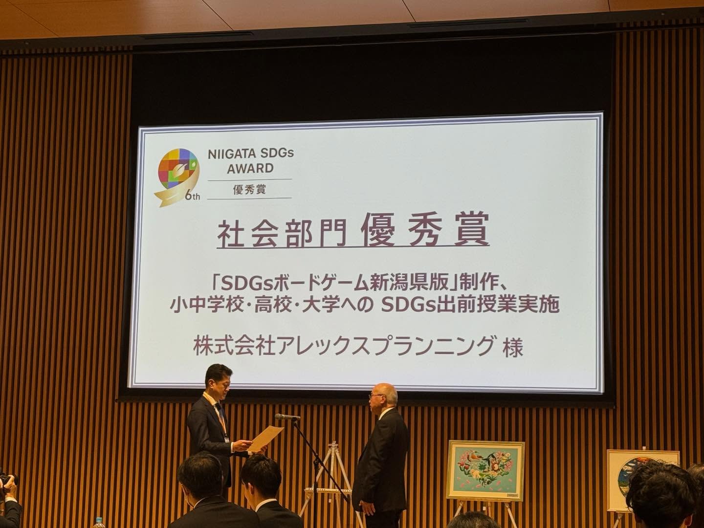 また、日頃より事業連携させていただいている株式会社アレックスプランニング様が、「SDGsボードゲーム新潟県版」の制作および小・中学校・高校・大学へのSDGs出前授業の取り組みにより、社会部門優秀賞を受賞されました。