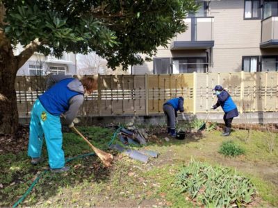 障がい者就労での庭清掃の様子をご紹介します。 様々な場所の広い庭の手入れ、掃…
